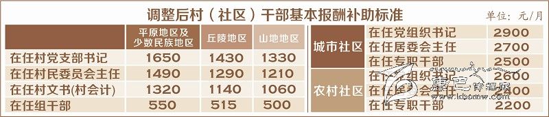 省上明確,此次村(社區(qū))干部基本報(bào)酬標(biāo)準(zhǔn)為最低補(bǔ)助標(biāo)準(zhǔn),各地可根據(jù)經(jīng)濟(jì)發(fā)展水平、城鄉(xiāng)居民收入狀況和工作需要進(jìn)行適當(dāng)增加調(diào)整,重點(diǎn)對(duì)村人口在3000人以上、高寒高海拔地區(qū)工作的提高補(bǔ)助標(biāo)準(zhǔn);對(duì)跨村兼職和兼任組干部的提高報(bào)酬待遇。各地要進(jìn)一步完善村(社區(qū))干部基本報(bào)酬激勵(lì)保障機(jī)制,繼續(xù)推行“固定報(bào)酬+績效報(bào)酬”制度,強(qiáng)化考評(píng)激勵(lì),充分調(diào)動(dòng)村(社區(qū))干部干事創(chuàng)業(yè)活力。