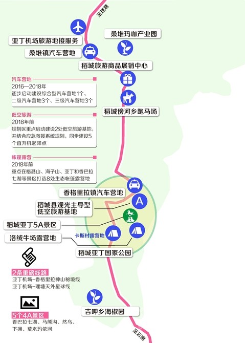 根據(jù)《規(guī)劃》,將結(jié)合道路交通和旅游景區(qū)景點(diǎn)分布,2016—2018年,逐步啟動(dòng)建設(shè)綜合型汽車營(yíng)地1個(gè)、二級(jí)汽車營(yíng)地3個(gè)、三級(jí)汽車營(yíng)地3個(gè),作為建設(shè)環(huán)亞丁兩小時(shí)旅游圈的重要旅游項(xiàng)目,滿足日益增長(zhǎng)的自駕車游客需求。