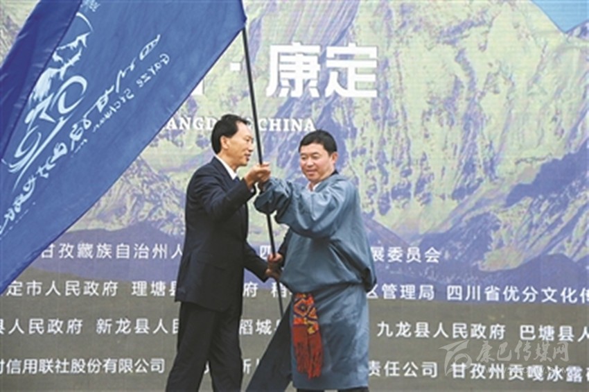 州委副書記、州政府州長肖友才向下一屆四川甘孜山地旅游節(jié)舉辦地丹巴縣交接會旗。 余秋林 記者 肖宵 攝