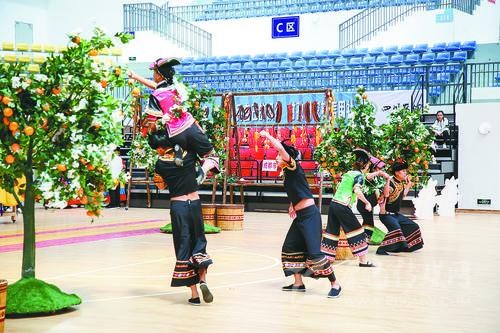 雅安市代表團教練李鏡文告訴記者,《石炯諧博》表演項目依托當?shù)匾图颐袼?,在黃果柑豐收的季節(jié),石棉縣彝族小伙、姑娘們在果林里采摘黃果柑時所產生的勞動趣味競技活動的演繹,反映了少數(shù)民族地區(qū)經濟發(fā)展、社會繁榮穩(wěn)定、各族人民安居樂業(yè)的生活和精神風貌。