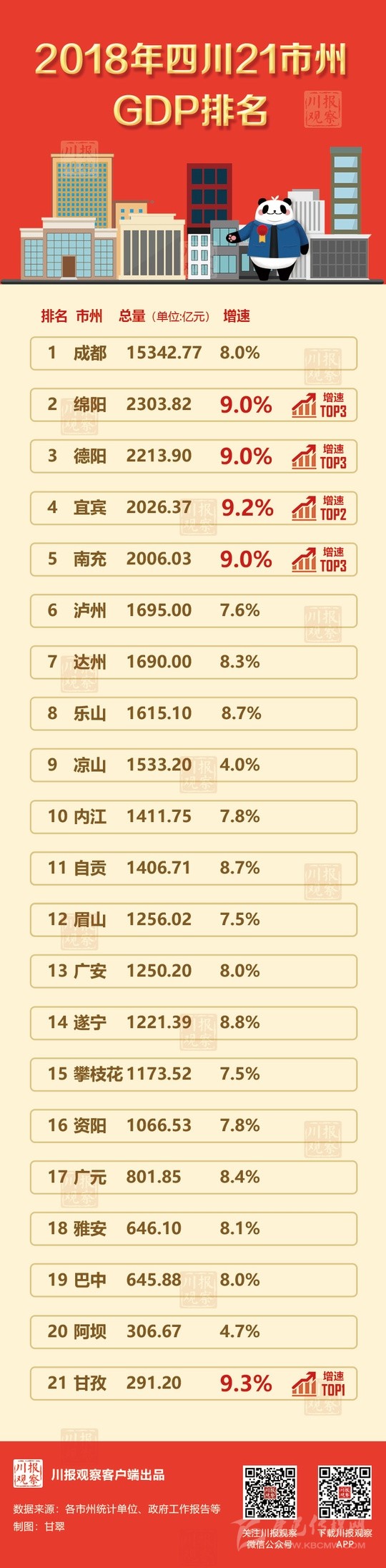 21個(gè)市州中,“主干”成都繼續(xù)“獨(dú)領(lǐng)風(fēng)騷”,以15342.77億元的成績(jī)牢牢占據(jù)“第一把交椅”。熟悉四川的朋友,對(duì)于成都的表現(xiàn)或許已經(jīng)習(xí)以為常。