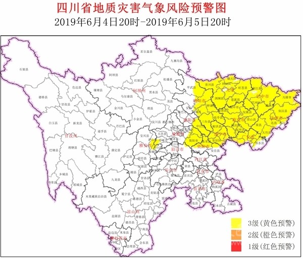 四川在線(xiàn)消息(記者 寇敏芳)6月4日,省自然資源廳發(fā)布全省地災(zāi)氣象風(fēng)險(xiǎn)預(yù)警。結(jié)合四川省氣象臺(tái)天氣預(yù)報(bào)情況,6月4日20時(shí)~6月5日20時(shí),全省地質(zhì)災(zāi)害氣象風(fēng)險(xiǎn)預(yù)警等級(jí)為3級(jí)(黃色預(yù)警,注意級(jí)),具體結(jié)果如下: