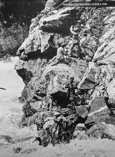 走過浮雕不到20米,一面組圖形成的墻面吸引了大量觀眾。一幅解放軍戰(zhàn)士在懸崖上開路的照片給人帶來巨大的視覺沖擊,這是當(dāng)年川藏公路修筑時的一幕,文字注解寫著:1954年12月,貫通“世界屋脊”的康藏公路、青藏公路全線通車,結(jié)束了西藏沒有公路的歷史……1955年10月,康藏公路改名為川藏公路。