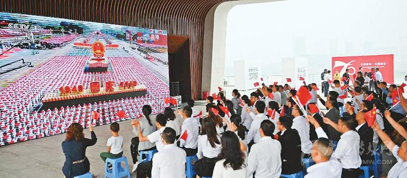 上午10時(shí),慶祝中華人民共和國(guó)成立70周年大會(huì)開始。通過電視信號(hào),大會(huì)盛況傳遞至每個(gè)現(xiàn)場(chǎng)。“與祖國(guó)母親同在,祝福祖國(guó)繁榮昌盛。”這是大家共同的心聲?!醣緢?bào)記者 林凌 何勤華 程文雯 徐中成 陳碧紅 文莎