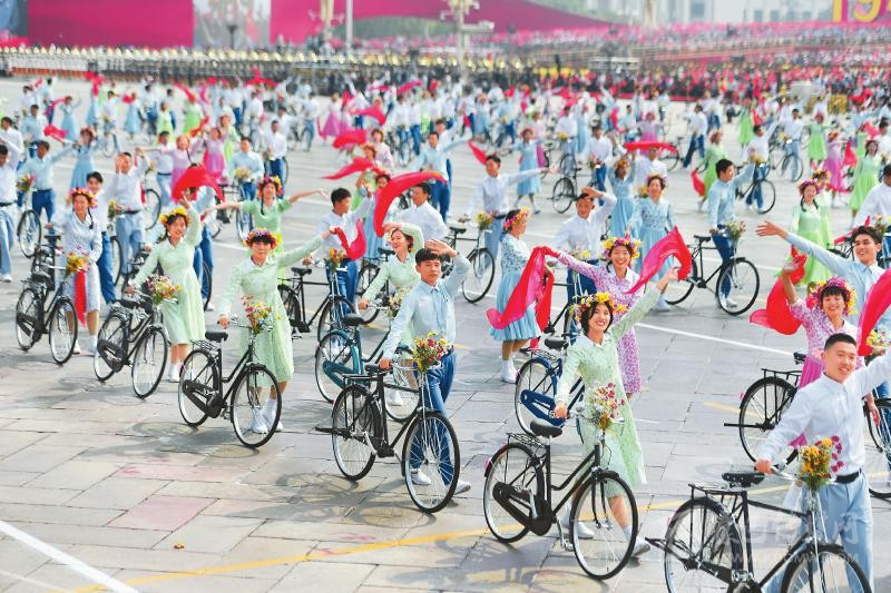 在10月1日上午進(jìn)行的國慶70周年群眾游行中,上百名少男少女騎著自行車從廣場通過。這個(gè)主題為“青春萬歲”的場景喚醒了很多人對20世紀(jì)80年代的時(shí)代記憶……這是本次群眾游行中的第一個(gè)情境式行進(jìn)。