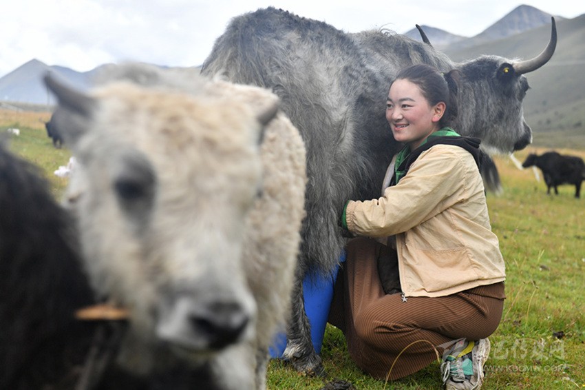 康定市俄達門巴村的一位姑娘在給牦牛擠奶。 新華社 發(fā)