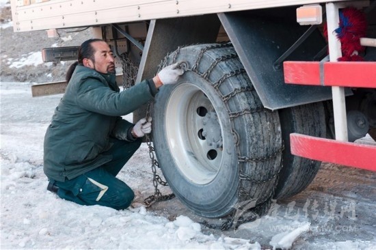 其美多吉在途中幫助社會車輛安裝防滑鏈(資料照片)。其美多吉是中國郵政甘孜縣分公司郵運駕駛組的一名郵車司機(jī),往返在甘孜縣與德格縣之間。這段路程是四川省甘孜州綿延5866公里、平均海拔超過3500米的雪線郵路最危險的一段。新華社發(fā)(周兵 攝)