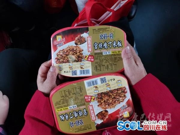 18日中午12時(shí), 列車出發(fā)2小時(shí)后,巴中恩陽人鄔兵領(lǐng)到了來自家鄉(xiāng)的午餐——一盒自熱米飯,配菜是宮保雞丁。“不錯(cuò)不錯(cuò),今年不用吃方便面了?!倍松厦罪埖泥w兵笑了笑。