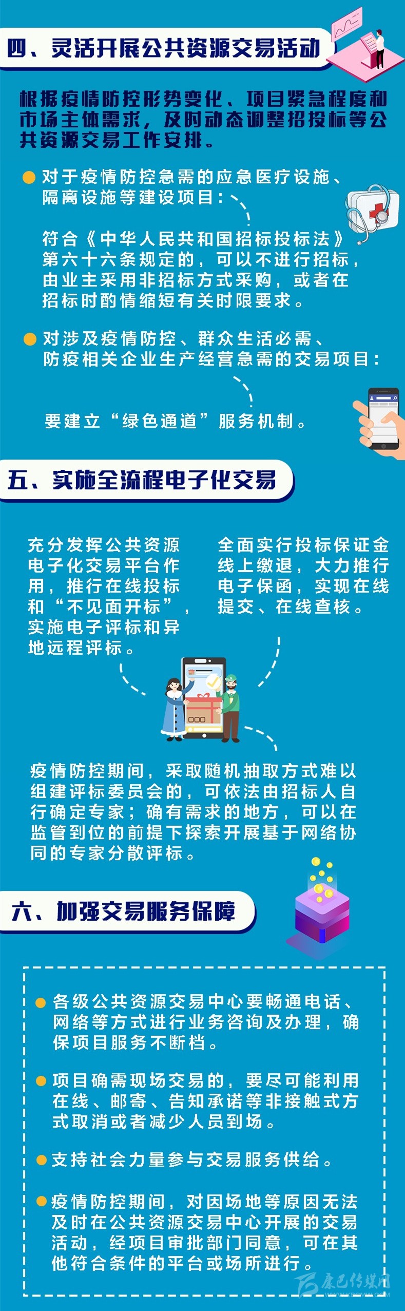 答:近年來,我省按照國家和省委省政府安排部署持續(xù)推進公共資源交易全流程電子化,取得了顯著成效。在疫情防控的特殊時期,更要充分發(fā)揮公共資源電子化交易平臺作用,推行在線投標和“不見面開標”,實施電子評標和異地遠程評標。同時,全面實行投標保證金線上繳退,大力推行電子保函,實現(xiàn)在線提交、在線查核。疫情防控期間,采取隨機抽取方式難以組建評標委員會的,可依法由招標人自行確定專家;確有需求的地方,可在監(jiān)管到位的前提下探索開展基于網(wǎng)絡協(xié)同的專家分散評標。
