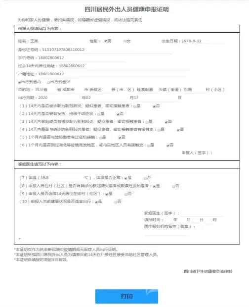 (二)服務內(nèi)容。居住地醫(yī)療衛(wèi)生機構(gòu)對申報人在開展流行病學史調(diào)查、測量體溫的基礎(chǔ)上,為符合條件的申報人出具《四川外出人員健康申報證明》。