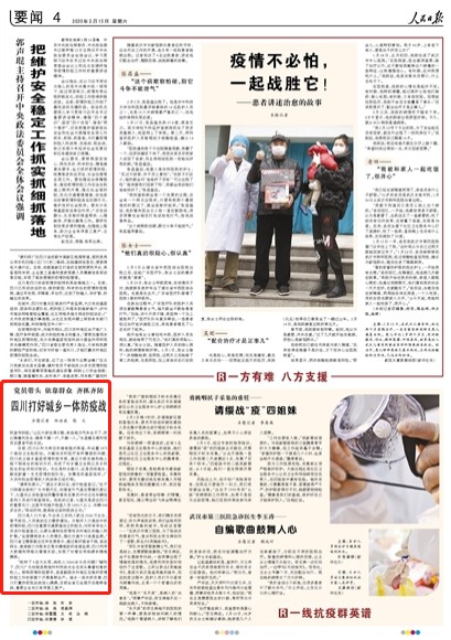 今天,人民日報刊發(fā)題為《黨員帶頭 依靠群眾 齊抓齊防——四川打好城鄉(xiāng)一體防疫戰(zhàn)》的文章,聚焦四川依法防治、聯(lián)防聯(lián)控、科學(xué)防治疫情,進(jìn)一步織密疫情防控網(wǎng)。
