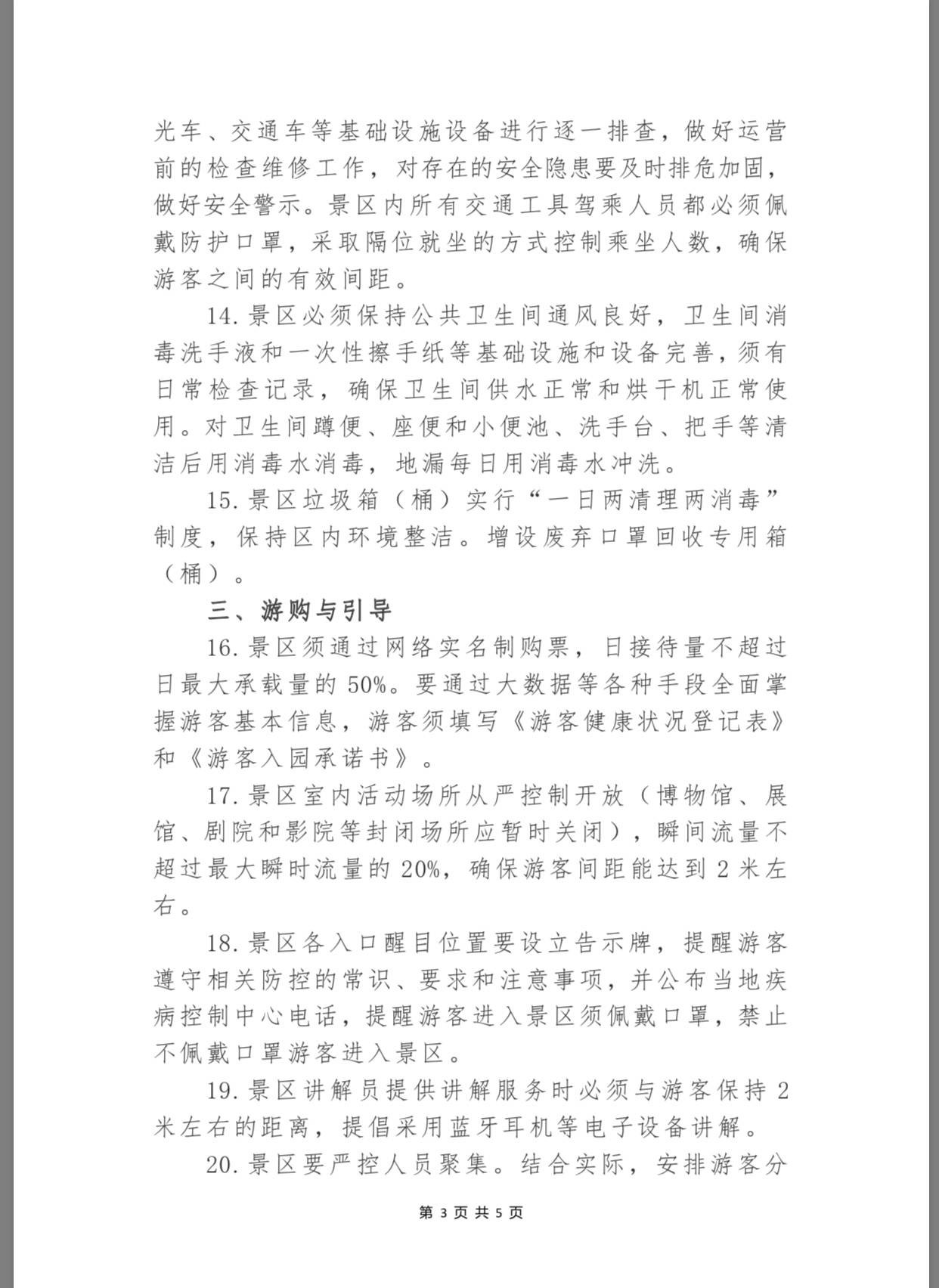 為保障景區(qū)安全有序恢復(fù)開放,景區(qū)游客服務(wù)中心和(志愿者或商業(yè))服務(wù)網(wǎng)點除放置免費中英文防治新冠肺炎的宣傳資料外,還要放置“本中心已消毒”告示,應(yīng)備有75%的酒精棉球或其它消毒液等免費供游客使用。同時,景區(qū)內(nèi)所有交通工具駕乘人員都必須佩戴防護(hù)口罩,采取隔位就坐的方式控制乘坐人數(shù),確保游客之間的有效間距,而垃圾箱(桶)則實行“一日兩清理兩消毒”制度,增設(shè)廢棄口罩回收專用箱(桶)。