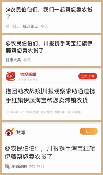 多地市州媒體及縣級融媒體中心的關(guān)注積極響應參與活動?!熬W(wǎng)信四川”公眾號、南充日報“南充見”、成都日報錦觀、眉山在線、開江發(fā)布、直播鹽亭、綿陽新聞網(wǎng)、宜賓日報、威遠組工、健康大英等均及時對活動相關(guān)信息進行了發(fā)布,及時把抱團助農(nóng)戰(zhàn)疫活動信息帶給當?shù)赜行枨蟮霓r(nóng)戶。