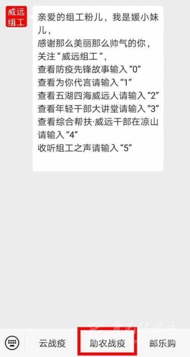 除了媒體之外,一些機關(guān)單位的政務新媒體也為活動“站臺”,“威遠組工”官方微信公眾號的底部菜單欄,特別新增了“助農(nóng)戰(zhàn)疫”專欄,直接連通川報觀察頁面,為當?shù)剞r(nóng)戶及農(nóng)業(yè)經(jīng)營戶提供解決難題的路徑。