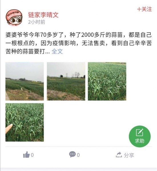 “婆婆爺爺今年70多歲了,種了2000多斤的蒜苗,都是自己一根根點的,因為疫情影響,無法售賣,看到自己辛辛苦苦種的蒜苗要打水漂,兩個老人都要急哭了?!奔易〕啥寂碇菔械睦钚〗阃ㄟ^“抱團助農(nóng)戰(zhàn)疫”平臺求助表示,希望能夠幫忙盡快處理這些蒜苗。