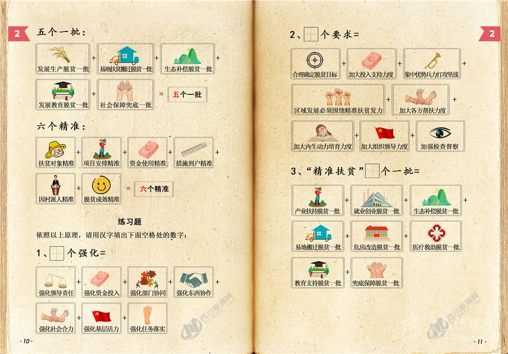 四川新聞網(wǎng)成都8月26日訊 又是周三啦?說(shuō)好的脫貧攻堅(jiān)小課堂如期而至!目前,打贏脫貧攻堅(jiān)戰(zhàn)進(jìn)入最后沖刺的關(guān)鍵階段,四川還有很多硬仗要打,很多“硬骨頭”要啃,防止返貧致貧任務(wù)繁重,脫貧攻堅(jiān)工作力度還需要加強(qiáng),面臨的困難和挑戰(zhàn)依然十分艱巨。為了深入推進(jìn)精準(zhǔn)扶貧精準(zhǔn)脫貧,奪取全省脫貧攻堅(jiān)收官之戰(zhàn)全面勝利,本課采用上一課剛剛學(xué)到的數(shù)字來(lái)總結(jié)歸納了脫貧攻堅(jiān)政策和方法的關(guān)鍵知識(shí)點(diǎn),以便讓廣大同學(xué)進(jìn)一步掌握這些政策、運(yùn)用這些方法,提高政策受益覆蓋面及知曉率,確保各項(xiàng)政策落到實(shí)處。