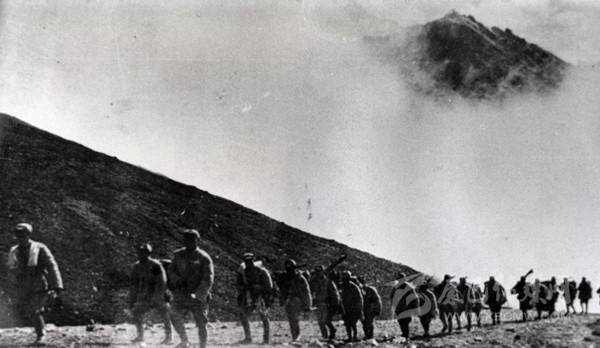 圖為進軍西藏途中的十八軍戰(zhàn)士,背后是高聳入云的山峰。圖片來源:網(wǎng)絡