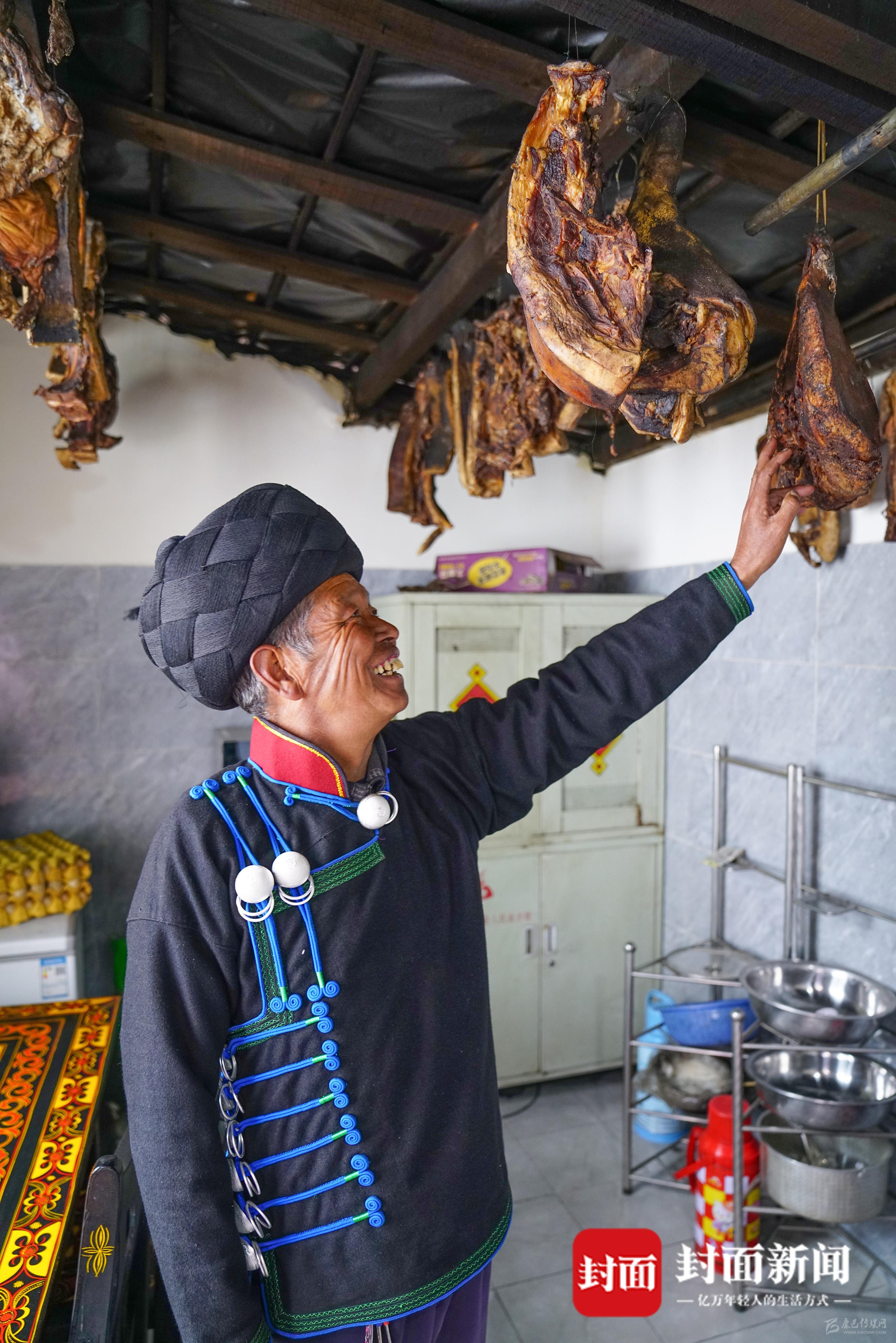 廚房里的物品,代表著彝家一年的收成。去年11月彝族年,吉地爾子家殺了兩頭年豬,做的臘肉、香腸,掛了滿滿一廚房。