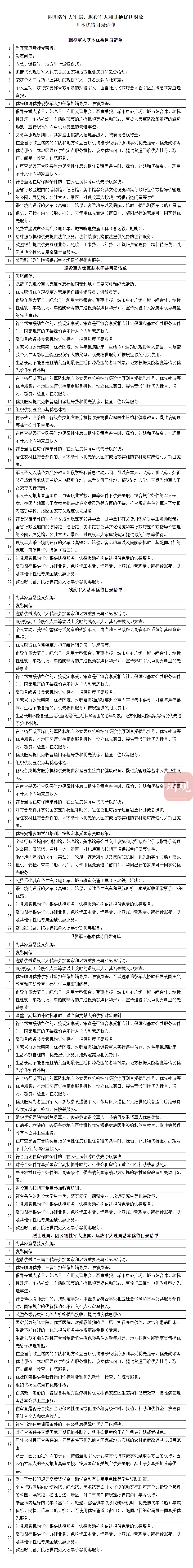 四川省軍人軍屬、退役軍人和其他優(yōu)撫對象基本優(yōu)待目錄清單:
