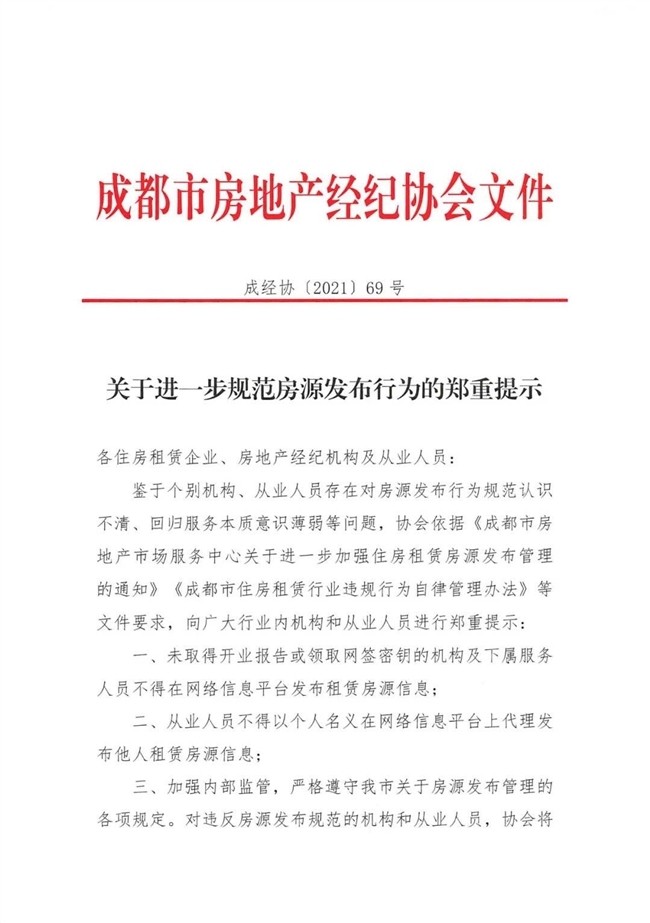 第三,加強內(nèi)部監(jiān)管,嚴格遵守成都市關(guān)于房源發(fā)布管理的各項規(guī)定。對違反房源發(fā)布規(guī)范的機構(gòu)和從業(yè)人員,該協(xié)會將依據(jù)行業(yè)自律規(guī)范文件予以相應(yīng)懲戒。