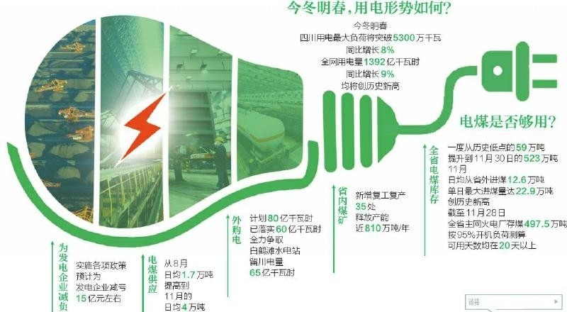 截至11月28日,全省主網(wǎng)火電廠存煤497.5萬(wàn)噸,按95%開(kāi)機(jī)負(fù)荷測(cè)算,可用天數(shù)均在20天以上。同時(shí),國(guó)網(wǎng)四川省電力公司全力落實(shí)外購(gòu)電量和留川電量,外購(gòu)電計(jì)劃80億千瓦時(shí)已落實(shí)60億千瓦時(shí),全力爭(zhēng)取白鶴灘水電站留川電量65億千瓦時(shí)。