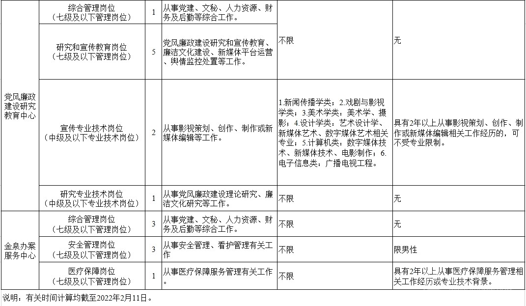 考調(diào)名額 考調(diào)事業(yè)人員25名。其中,信息技術(shù)中心管理崗位9名,黨風(fēng)廉政建設(shè)研究教育中心管理崗位6名、專業(yè)技術(shù)崗位3名,金泉辦案服務(wù)中心管理崗位7名。 考調(diào)對象及條件 考調(diào)對象 全省范圍內(nèi)行政單位或參公事業(yè)單位一級主任科員(含)以下職級及相當職務(wù)層次人員;縣級及以上公益一類或全額撥款事業(yè)單位管理崗位七級及以下職員、專業(yè)技術(shù)崗位中級及以下工作人員。 考調(diào)條件 具有良好的政治素質(zhì)、專業(yè)素養(yǎng),品行端正,實績突出,群眾公認。 中共黨員。 全日制大學(xué)本科及以上學(xué)歷,并取得相應(yīng)學(xué)士及以上學(xué)位。 年齡35周歲以下(1986年2月11日及以后出生)。 歷年年度考核均為合格(稱職)及以上。 身體心理健康,具有正常履行職責(zé)的身體條件和心理素質(zhì)。 符合報考崗位規(guī)定的資格條件,詳見《中共四川省紀委四川省監(jiān)委2022年公開考調(diào)事業(yè)人員崗位情況表》(附后)。 符合法律、法規(guī)規(guī)定的其他條件。 有關(guān)時間計算均截至2022年2月11日。 具有下列情形之一的,不得報考: 被依法列為失信聯(lián)合懲戒對象的。 涉嫌違紀違法正在接受有關(guān)專門機關(guān)審查尚未作出結(jié)論的。 受過黨紀政務(wù)處分或司法機關(guān)刑事處罰的。 受到誡勉、組織處理等影響期未滿或期滿影響使用的。 按照有關(guān)規(guī)定,到定向單位工作未滿服務(wù)年限或有其他限制性規(guī)定的。 尚在試用期的。 按照相關(guān)規(guī)定應(yīng)當回避的。 法律、法規(guī)規(guī)定的其他情形。 報名及打印準考證 2022年2月22日上午8:00至2月26日下午18:00,報名人員登錄四川省人力資源和社會保障廳官網(wǎng)(http://rst.sc.gov.cn/)首頁“人事考試”專欄進行網(wǎng)上報名,每人限報一個崗位。 對報名人員進行網(wǎng)上資格初審,通過資格初審者可于2022年3月1日上午8:00至3月2日下午18:00,登陸報名系統(tǒng)打印筆試準考證。 考試 考試分筆試和面試。其中,信息技術(shù)崗位A、信息技術(shù)崗位B、宣傳專業(yè)技術(shù)崗位需加試專業(yè)測試。 根據(jù)筆試情況,擇優(yōu)確定進入面試的人選,并適時開展資格復(fù)審和心理素質(zhì)測試。資格復(fù)審、心理素質(zhì)測試、面試時間和地點另行電話通知。 考察、體檢及試用 考察 根據(jù)考試情況,擇優(yōu)差額確定進入考察對象,深入考察了解人選政治表現(xiàn)、工作能力、廉潔自律和性格特點等。 體檢 根據(jù)考察情況和職位要求,擇優(yōu)等額確定進入體檢人選,參照《公務(wù)員錄用體檢通用標準(試行)》進行體檢。 頂崗試用 綜合人選考試成績、考察情況,根據(jù)工作需要和人崗相適原則,擇優(yōu)確定頂崗試用人選。 調(diào)入 試用期滿后,根據(jù)考調(diào)名額和試用期間表現(xiàn),研究確定擬調(diào)人員,經(jīng)公示后按規(guī)定程序辦理調(diào)入手續(xù)。 注意事項 報考者應(yīng)保證提供真實、準確、全面的個人信息和資料,如有弄虛作假的行為,將按有關(guān)規(guī)定嚴肅處理。 資格審查貫穿考調(diào)全過程,任一環(huán)節(jié)發(fā)現(xiàn)有不符合考調(diào)條件的,取消考調(diào)資格。 報名時請按要求填寫本人手機號碼,并保持通訊暢通。未入圍下一環(huán)節(jié)人員,不再另行通知。 進入資格復(fù)審者,需由有干部管理權(quán)限的主管部門出具同意考調(diào)的書面意見并加蓋公章。 嚴明考調(diào)紀律,報名者不得托人說情、打招呼,一經(jīng)發(fā)現(xiàn)即取消資格。 遵守疫情防控相關(guān)規(guī)定,服從工作人員安排。 同時,四川省紀委監(jiān)委還提供相關(guān)咨詢電話:028—62555435;62555354。 (點擊查看大圖)