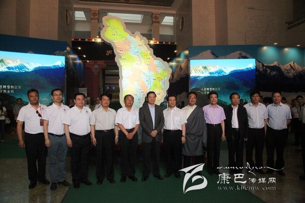 在一幅巨大的貢嘎云海風光圖片前,劉奇葆興致勃勃地與陪同視察的領(lǐng)導(dǎo)合影留念。