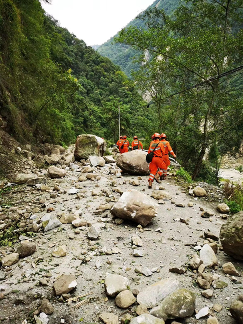 這是采訪小分隊(duì)拍到的救援隊(duì)員經(jīng)過(guò)遍地落石路段。