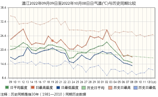 在盆地區(qū),溫江國家氣象站的觀測顯示,10月2日以來,當?shù)氐娜掌骄鶜鉁?、日最高氣溫、日最低氣溫都是一路快速下行,使前期偏高的氣溫向著歷史均值快速回歸。