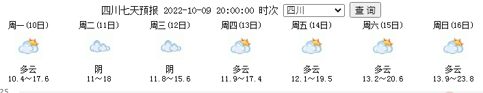 中央氣象臺預計,10月10日20時至11日20時,四川西部和南部有小到中雨;10月11日20時至12日20時,四川大部有小到中雨。