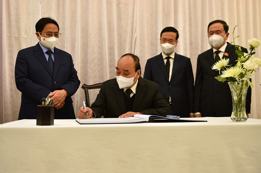 12月2日,越南國(guó)家主席阮春福(左二)、總理范明政(左一)等在中國(guó)駐越南大使館吊唁江澤民同志。 新華社記者 胡佳麗 攝
