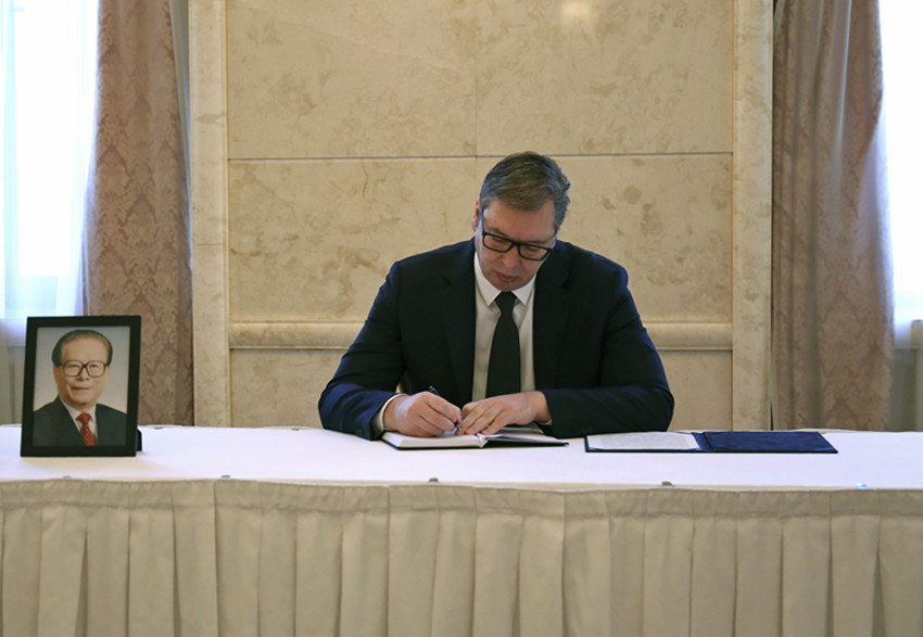 12月3日,塞爾維亞總統(tǒng)武契奇在中國(guó)駐塞爾維亞大使館吊唁江澤民同志。 中國(guó)駐塞爾維亞大使館供圖(新華社 發(fā))