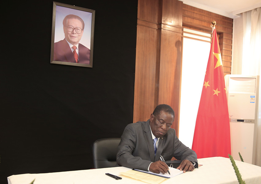12月5日,津巴布韋總統(tǒng)姆南加古瓦在中國(guó)駐津巴布韋大使館吊唁江澤民同志。 肖恩·朱薩 攝(新華社 發(fā))