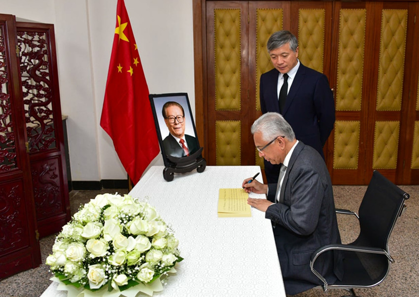 12月2日,毛里求斯總理賈格納特在中國(guó)駐毛里求斯大使館吊唁江澤民同志。 中國(guó)駐毛里求斯大使館供圖(新華社 發(fā))