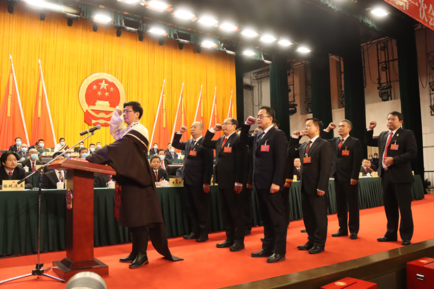 州十三屆人大一次會(huì)議上,當(dāng)選的州政府班子成員和州監(jiān)察委員會(huì)主任、州中級(jí)人民法院院長(zhǎng)向憲法宣誓。