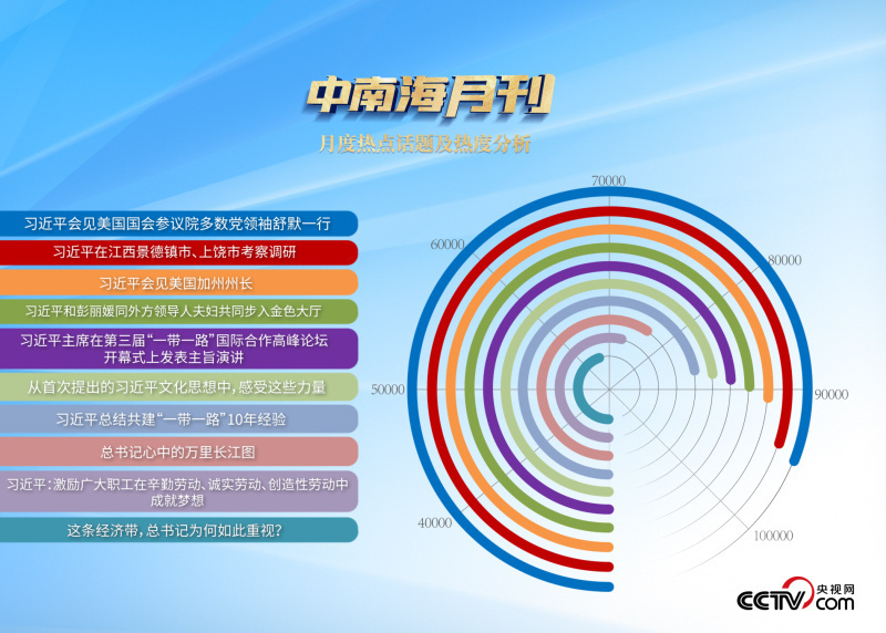 央視網“智聞”系統提取分析10月全網時政新聞熱點顯示,“習近平主席會見美國國會參議院多數黨領袖舒默一行”“習近平會見美國加州州長”“習近平主持召開進一步推動長江經濟帶高質量發(fā)展座談會”等話題最受網民關注。