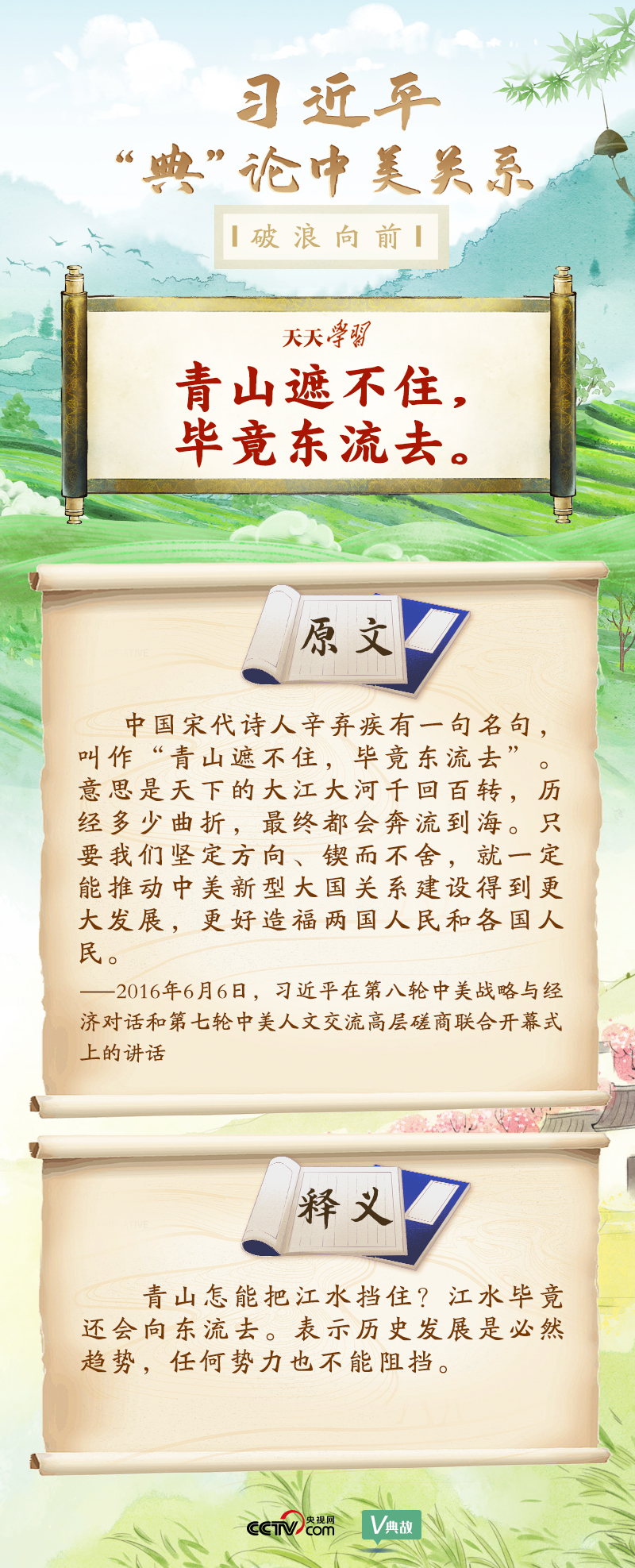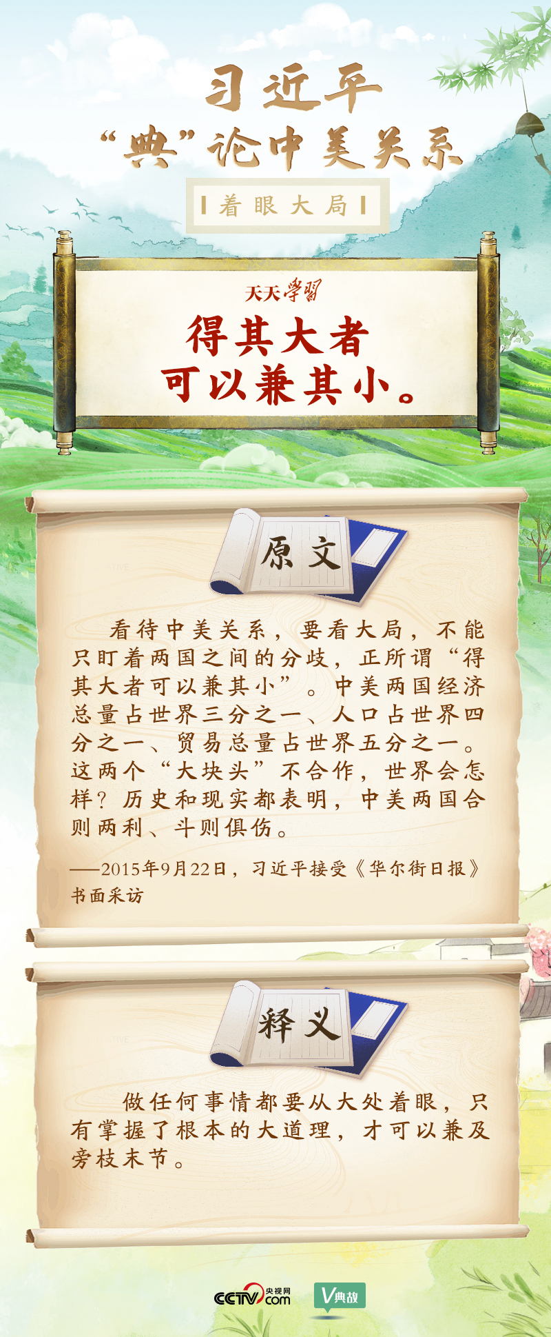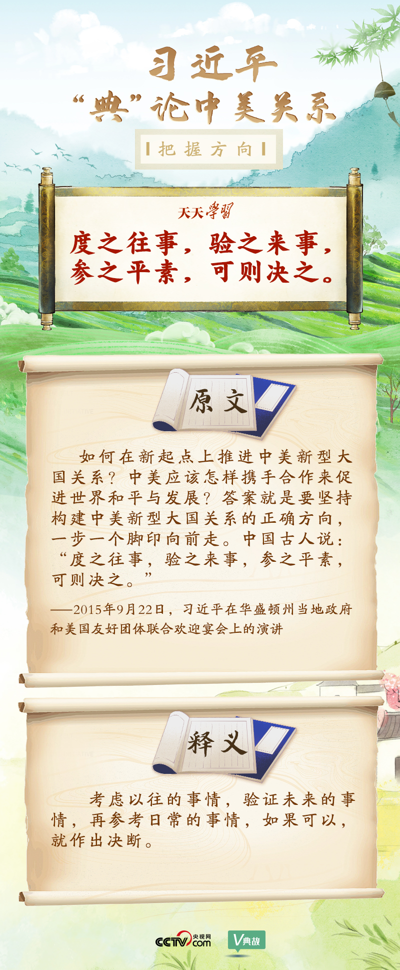 黨的十八大以來,習(xí)近平主席就中美關(guān)系發(fā)表了一系列重要講話。他站在時代高度分析、研判中美關(guān)系現(xiàn)狀及發(fā)展趨勢,并引經(jīng)據(jù)典為發(fā)展中美關(guān)系指出正確方向。這些論述蘊含深刻的戰(zhàn)略思維和政治智慧,具有重大現(xiàn)實意義和深遠歷史意義。央視網(wǎng)《天天學(xué)習(xí)》與您一起深刻領(lǐng)會。