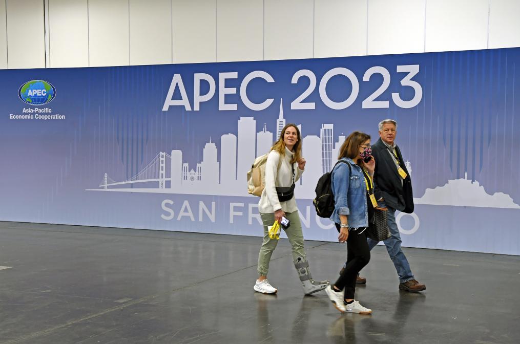 11月12日,在美國(guó)舊金山,記者經(jīng)過2023年亞太經(jīng)合組織會(huì)議國(guó)際媒體中心內(nèi)的一幅海報(bào)。新華社記者李睿 攝