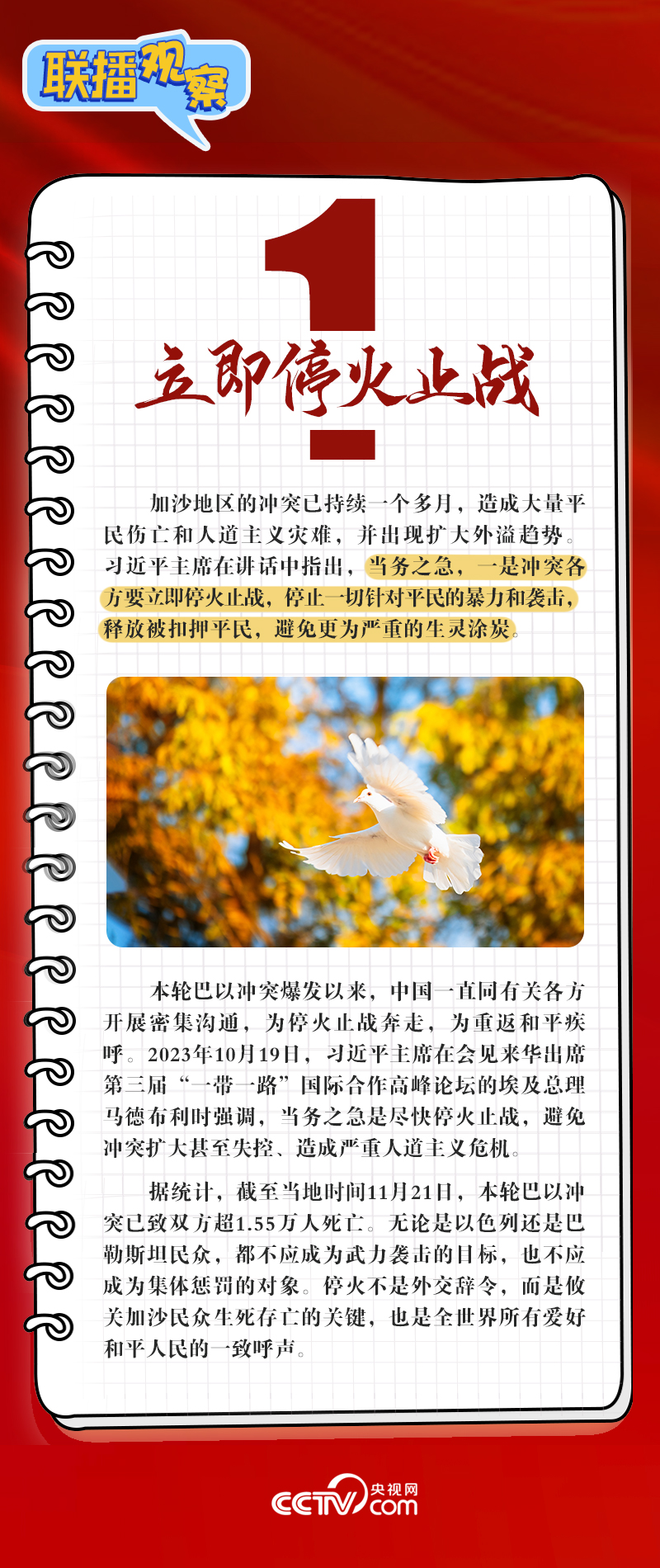 11月21日晚,中國國家主席習近平出席金磚國家領導人巴以問題特別視頻峰會并發(fā)表重要講話,呼吁沖突各方立即?;鹬箲?zhàn)。中方呼吁盡快召開更具權威性的國際和會,凝聚國際促和共識,推動巴勒斯坦問題早日得到全面、公正、持久解決。