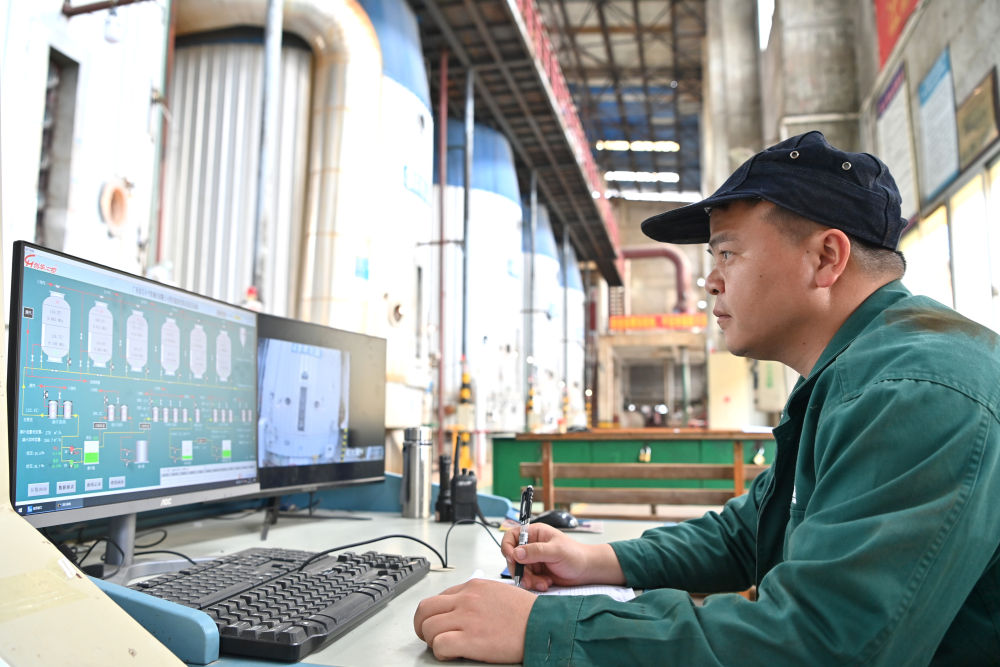 12月12日,工作人員在廣西來賓小平陽湘桂制糖有限公司監(jiān)控蒸發(fā)系統(tǒng)。