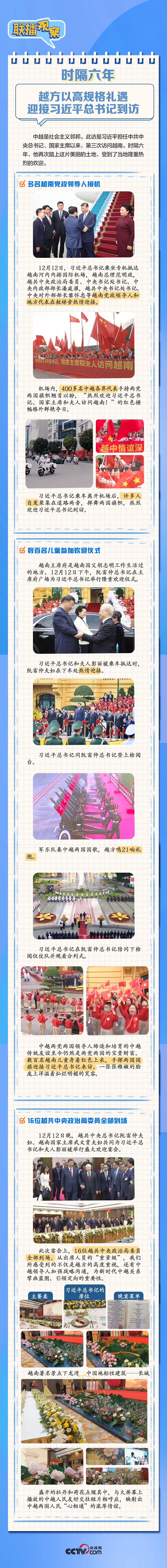 多名越南黨政領(lǐng)導(dǎo)人接機(jī)、中越各界代表手持兩黨兩國旗幟夾道歡迎、16位越共中央政治局委員全部到場參加歡迎宴會……訪越期間,習(xí)近平總書記受到越方高規(guī)格熱情接待,點滴細(xì)節(jié)見證兩國“同志加兄弟”情誼。