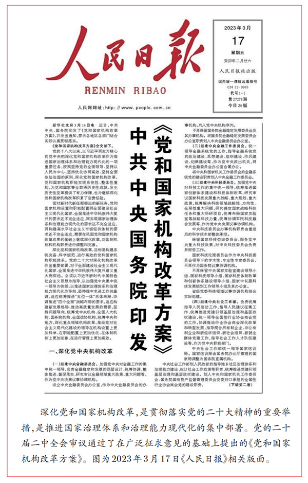 2023年2月,黨的二十屆二中全會審議通過《黨和國家機(jī)構(gòu)改革方案》,推動(dòng)黨對社會主義現(xiàn)代化建設(shè)的領(lǐng)導(dǎo)在機(jī)構(gòu)設(shè)置上更加科學(xué)、在職能配置上更加優(yōu)化、在體制機(jī)制上更加完善、在運(yùn)行管理上更加高效。