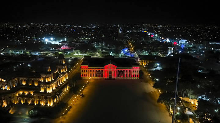 2022年1月31日,尼加拉瓜首都馬那瓜市中心標(biāo)志性建筑國家宮點(diǎn)亮“中國紅”(無人機(jī)照片)。
