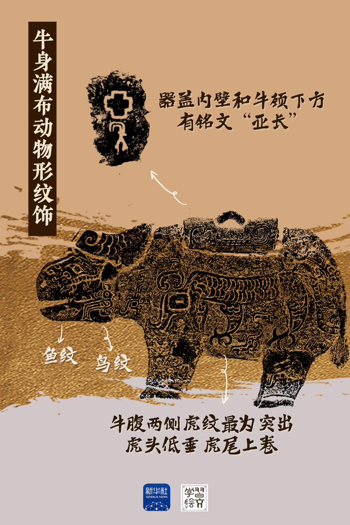 ??亞長(zhǎng)牛尊是截至目前殷墟發(fā)現(xiàn)的唯一一件牛形青銅容器。“亞”是武官的稱謂,“長(zhǎng)”是家族姓氏,墓主人亞長(zhǎng)是商王朝南部“長(zhǎng)”國(guó)的部落首領(lǐng)。