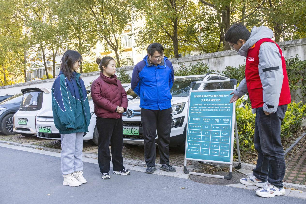 △ 2023年12月1日,工作人員在江蘇省泰州市蘇源花園二期居民區(qū)給車主講解執(zhí)行居民電價相關優(yōu)惠政策。