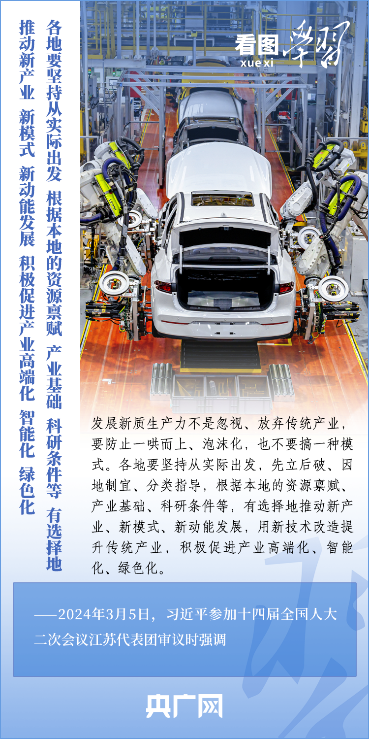 3月5日,十四屆全國(guó)人大二次會(huì)議正式開幕。5日下午,習(xí)近平總書記參加他所在的江蘇代表團(tuán)審議時(shí)強(qiáng)調(diào),要牢牢把握高質(zhì)量發(fā)展這個(gè)首要任務(wù),因地制宜發(fā)展新質(zhì)生產(chǎn)力。發(fā)展新質(zhì)生產(chǎn)力不是忽視、放棄傳統(tǒng)產(chǎn)業(yè),要防止一哄而上、泡沫化,也不要搞一種模式。一起來學(xué)習(xí)!