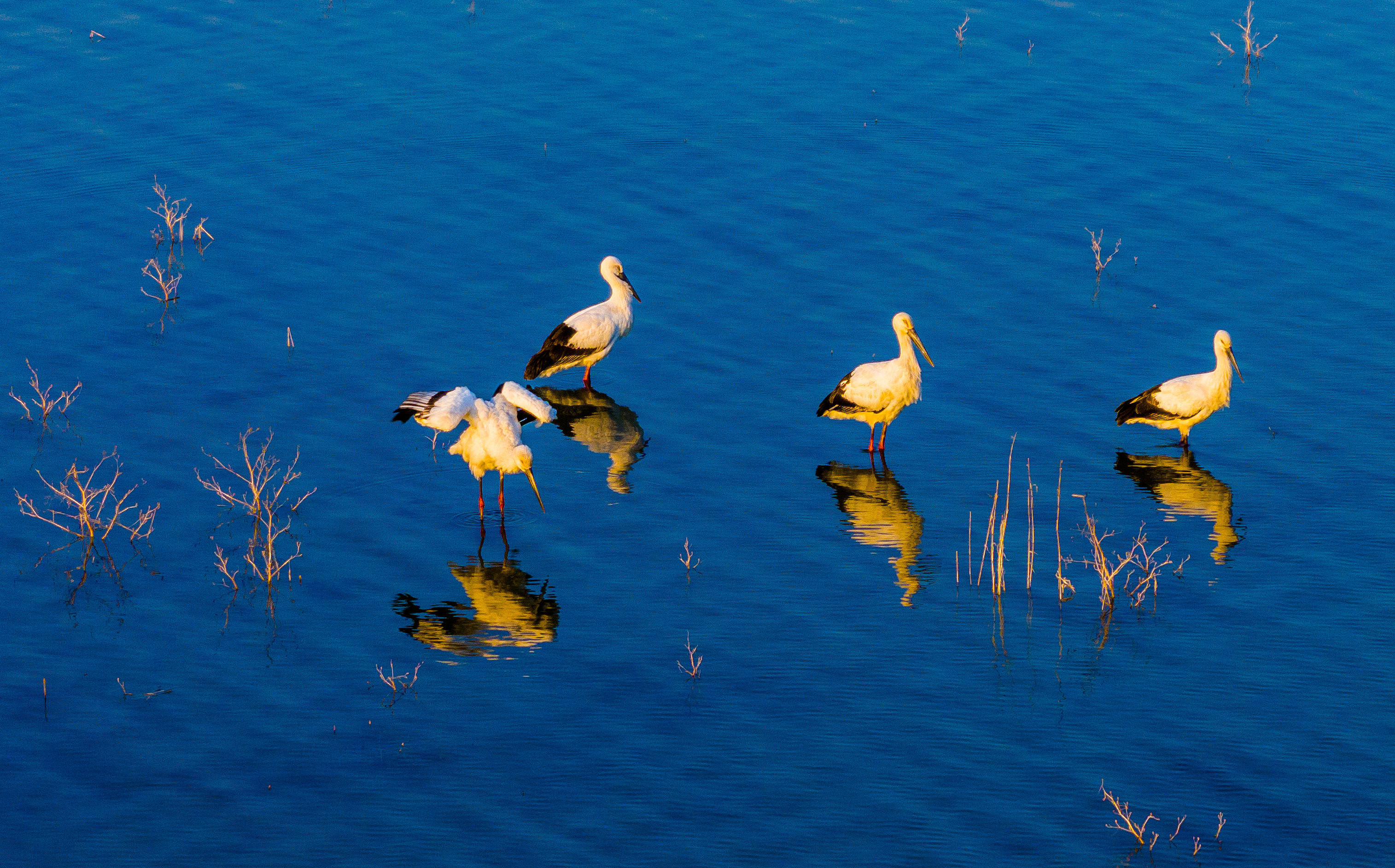 △ 2023年12月1日,安徽淮北,烈山區(qū)化家湖,4只遷徙的國寶級野生動物東方白鸛在休憩、覓食。