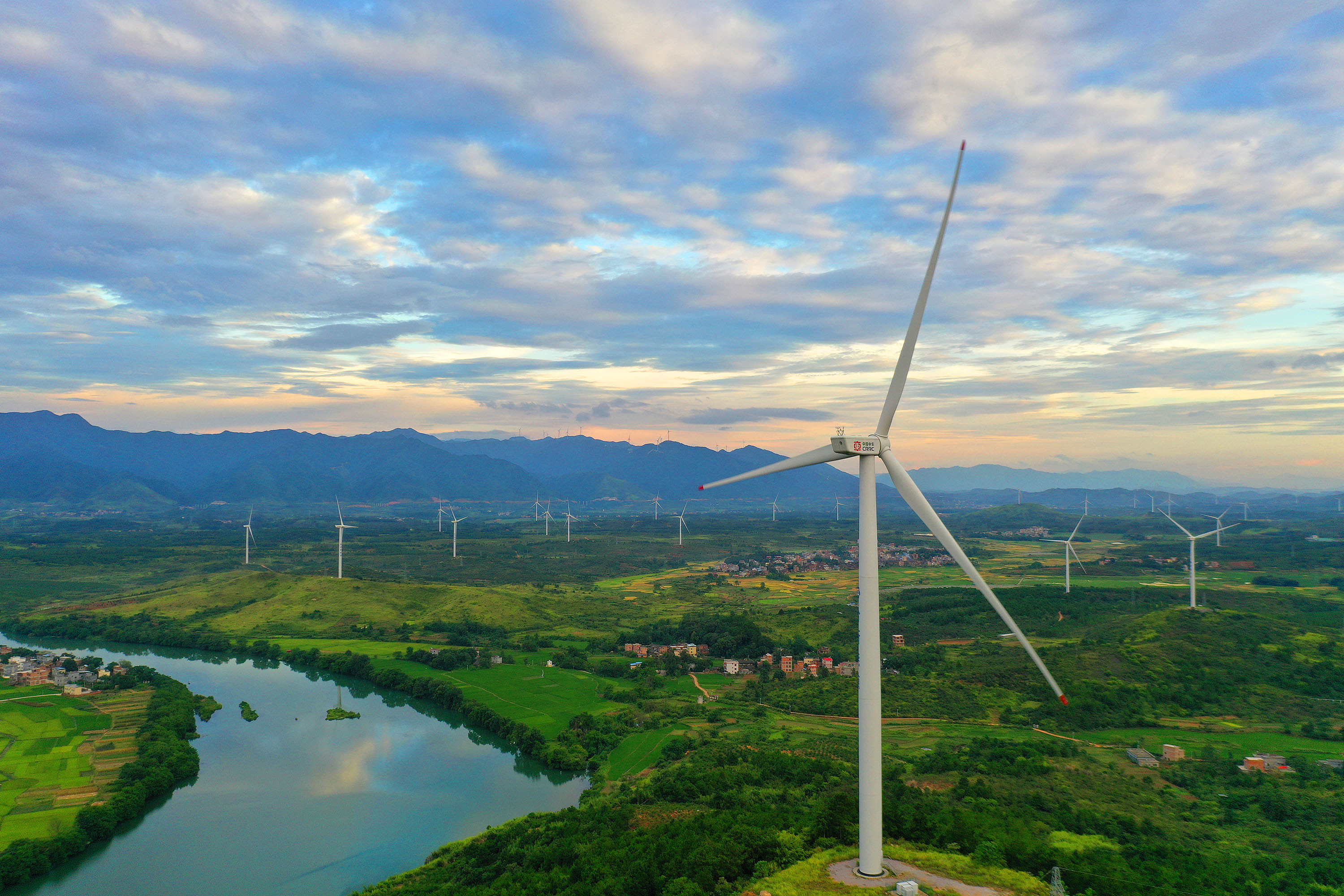 △ 湖南省永州市的風力發(fā)電風車與藍天、綠水、田野交相輝映,構成一幅美麗的生態(tài)畫卷。