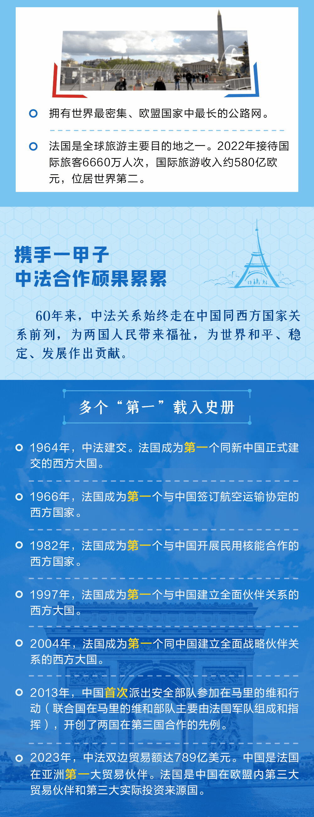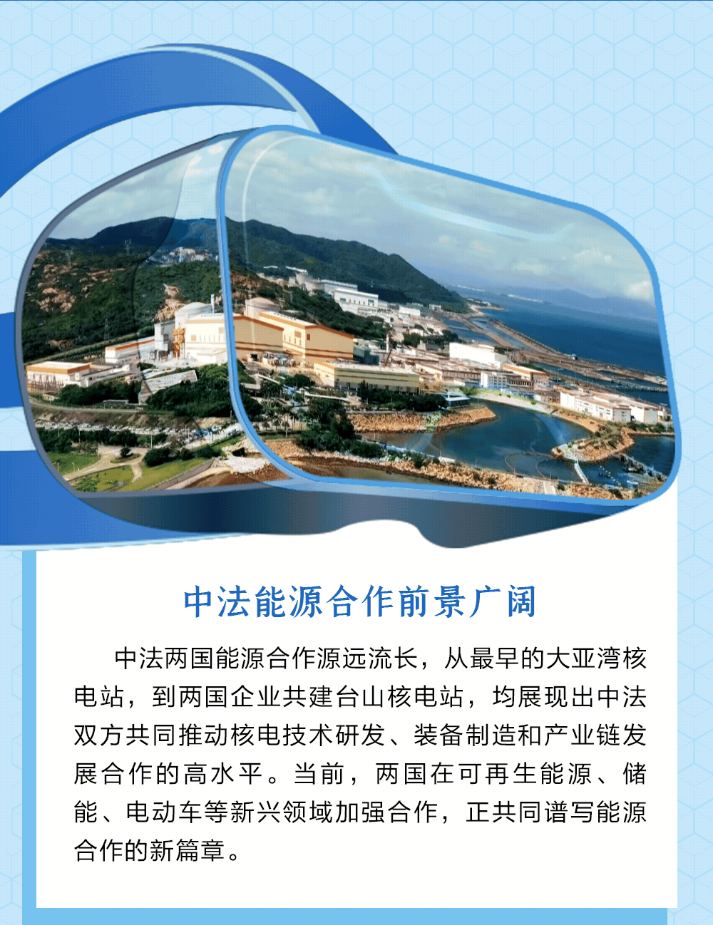 “法國是第一個同新中國正式建交的西方大國,也是最早同中國建立戰(zhàn)略伙伴關(guān)系和開展戰(zhàn)略對話、最早同中國開展民用核能合作的國家?!绷?xí)近平主席強調(diào),中法是特殊的朋友,共贏的伙伴。