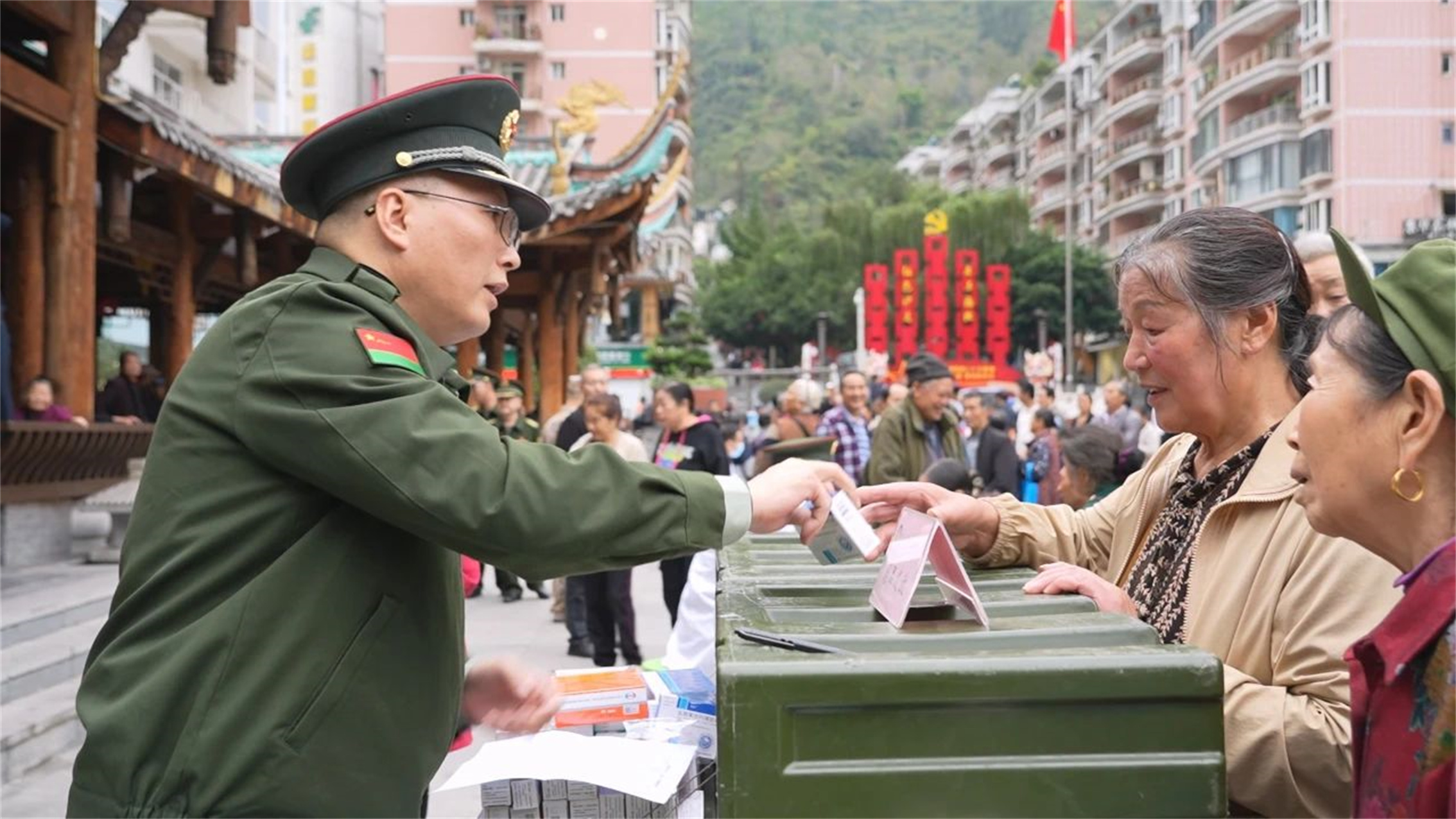 圖為在義診現(xiàn)場,藥師為患者發(fā)放免費藥品,并仔細叮囑用藥注意事項。